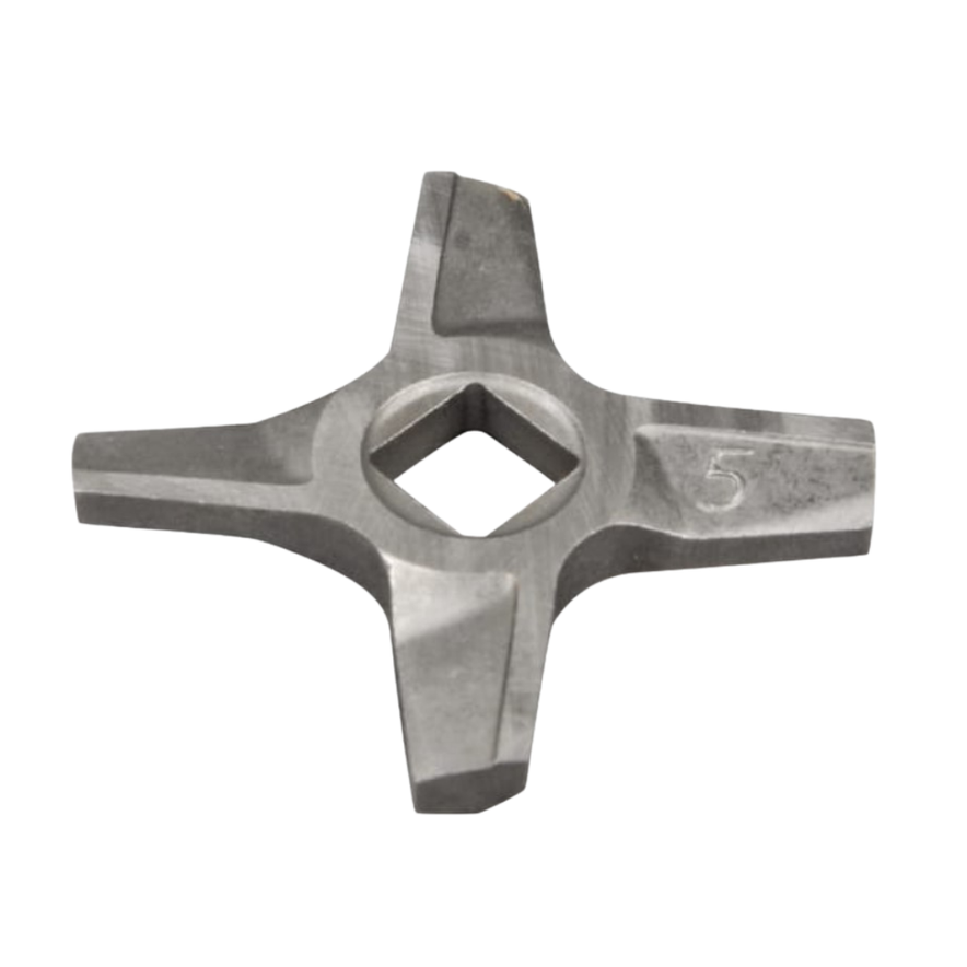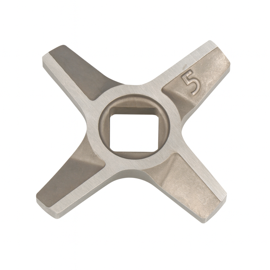 Trwały nożyk dwustronny nr 5 wykonany z wysokiej jakości stali nierdzewnej (INOX), przeznaczony do maszynek do mięsa Zelmer, Bosch, Zelmotor oraz innych urządzeń z komorą mielenia nr 5.